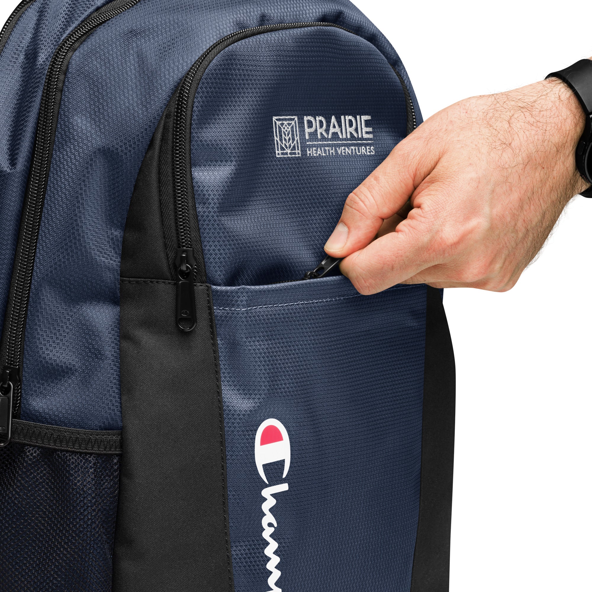 • Front zip pocket with printed Champion brand logo, containing an organizational compartment