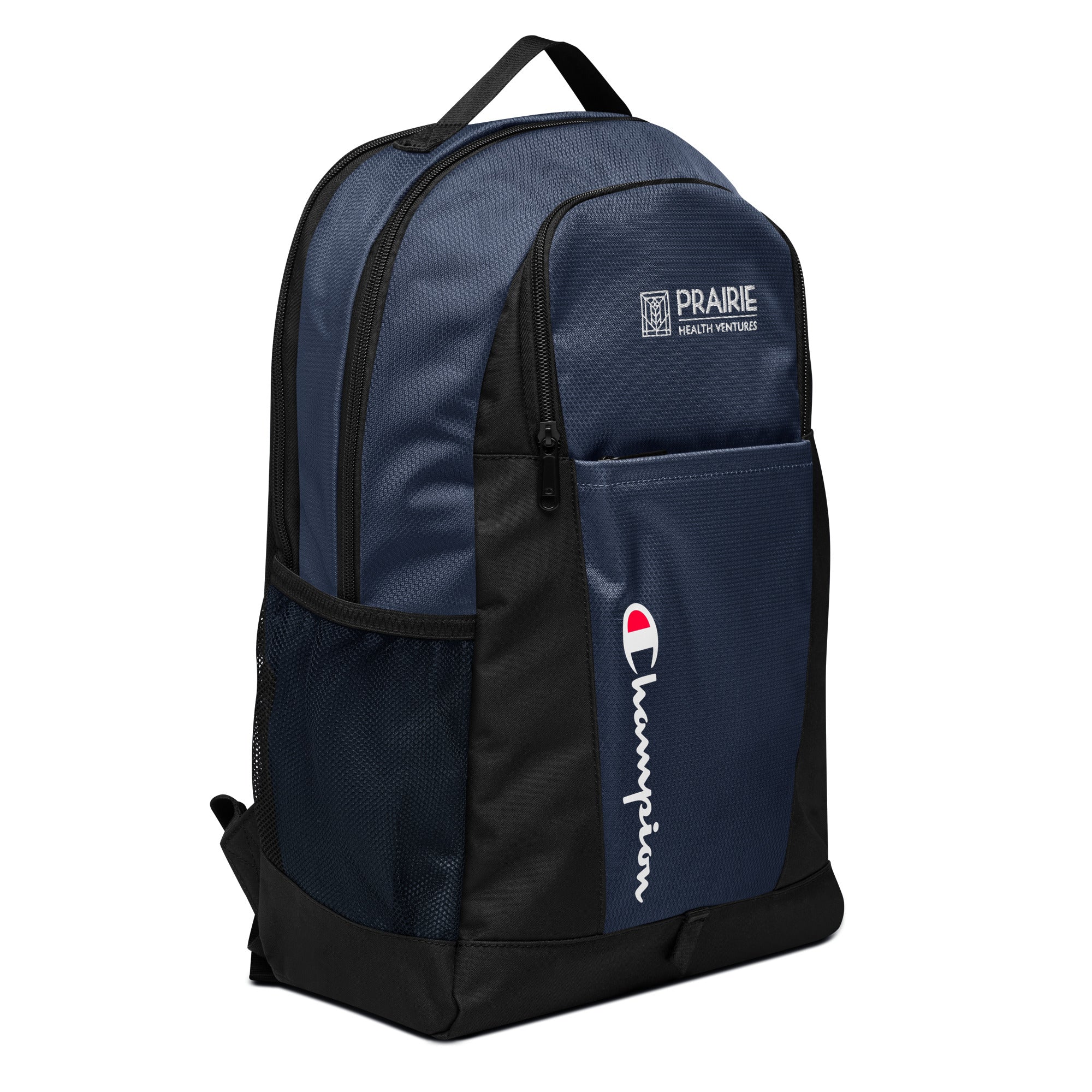 • Padded ergonomic polyester bag straps with plastic strap regulators and Champion brand label on the left strap